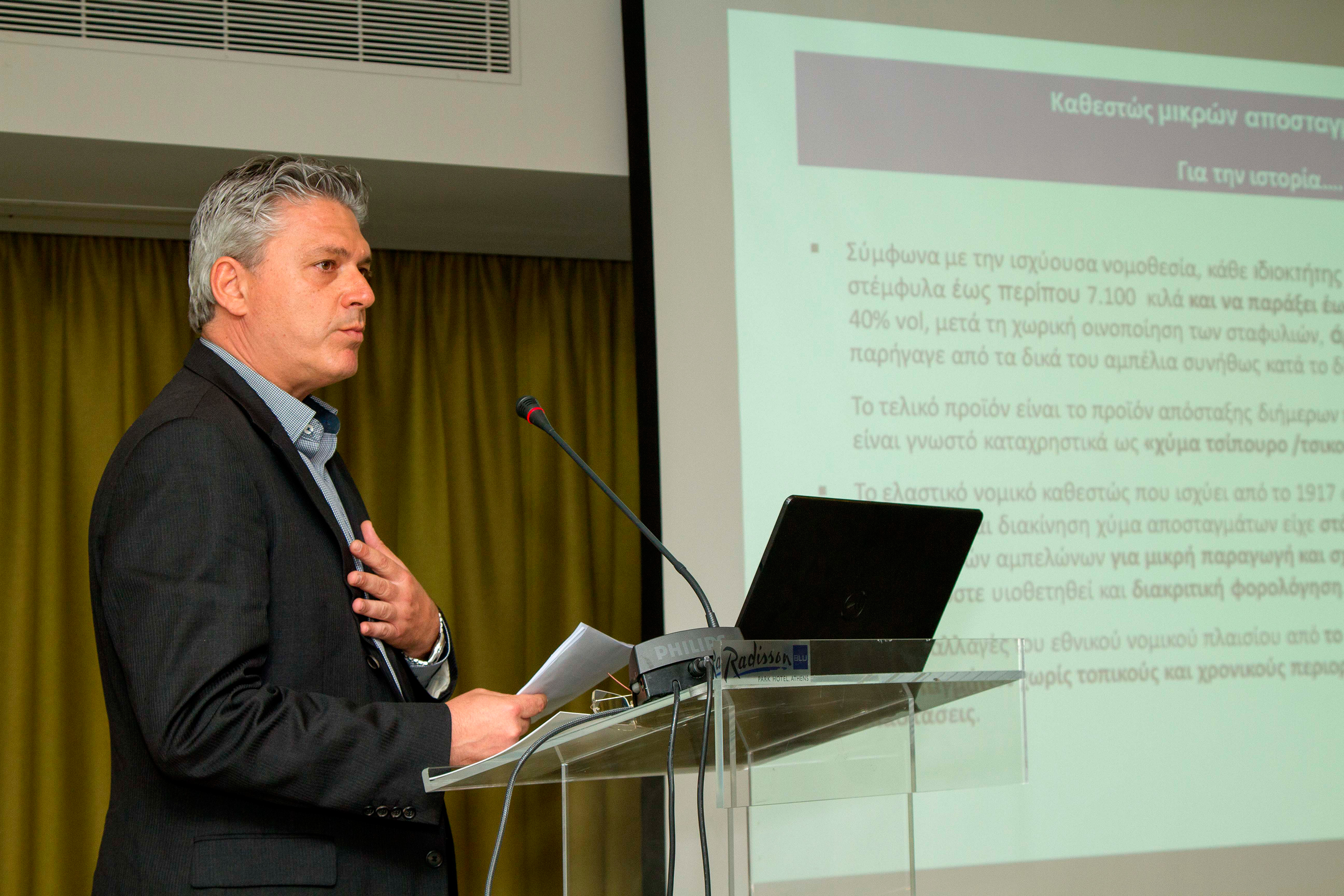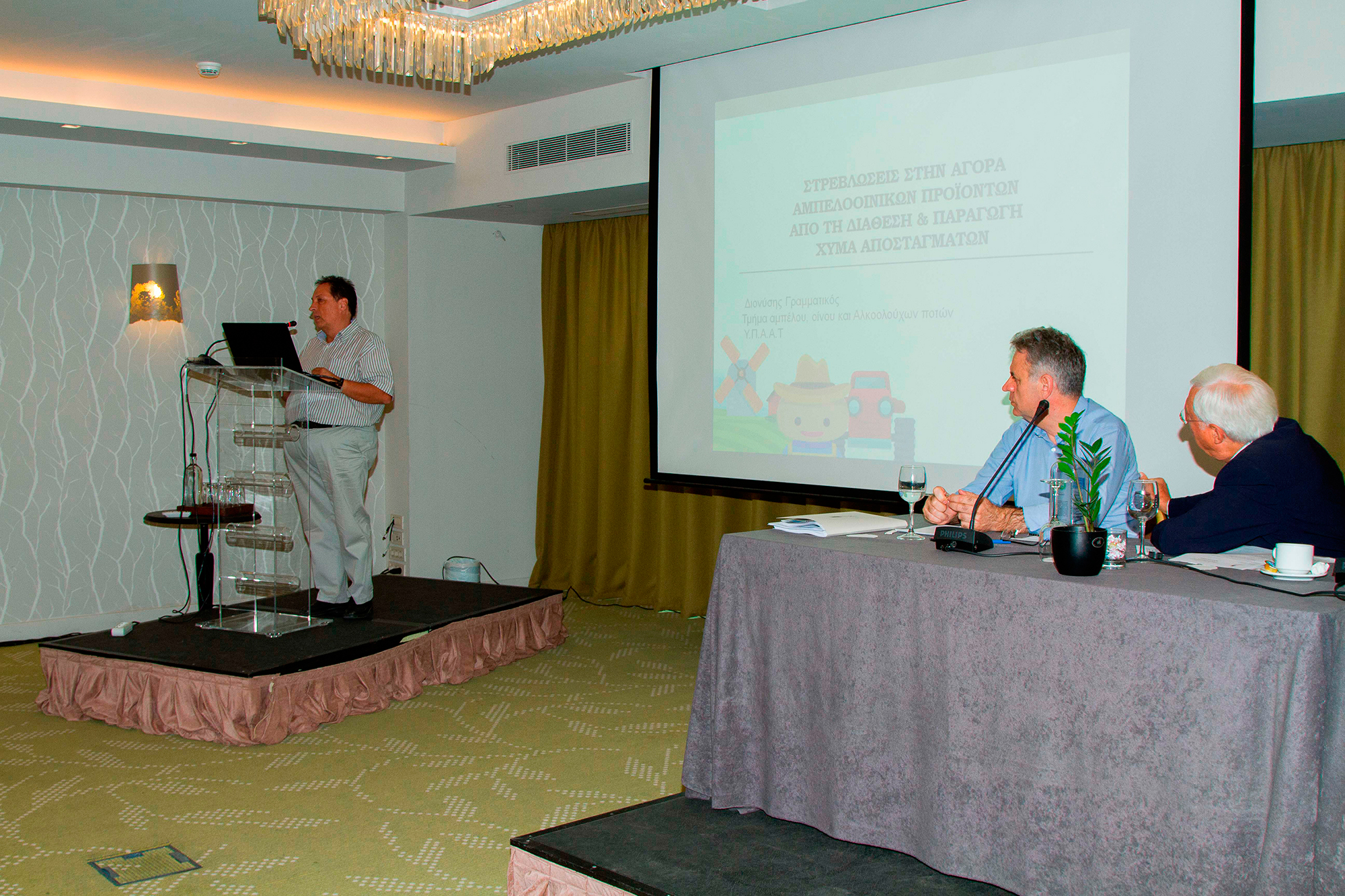 Ο κ. Διονύσης Γραμματικός προϊστάμενος του Τμήματος Αμπέλου & Αλκοολούχων Ποτών του Υπ.Α.Α.Τ. αναφέρθηκε στις στρεβλώσεις στην αγορά των αμπελοοινικών προϊόντων από την διάθεση & παραγωγή των χύμα αποσταγμάτων. Οι παράνομες εμπορικές πρακτικές των παραγωγών, η ελλιπής εποπτεία από πλευράς της Πολιτείας όσον αφορά την ποιότητα & την ποσότητα των προϊόντων αλλά και των πρώτων υλών, είναι μερικά από τα προβλήματα που επεσήμανε στην ομιλία του ο κ. Γραμματικός. Κλείνοντας τόνισε ότι απαιτείται στενή συνεργασία και ανταλλαγή πληροφοριών μεταξύ των εμπλεκομένων Υπηρεσιών .